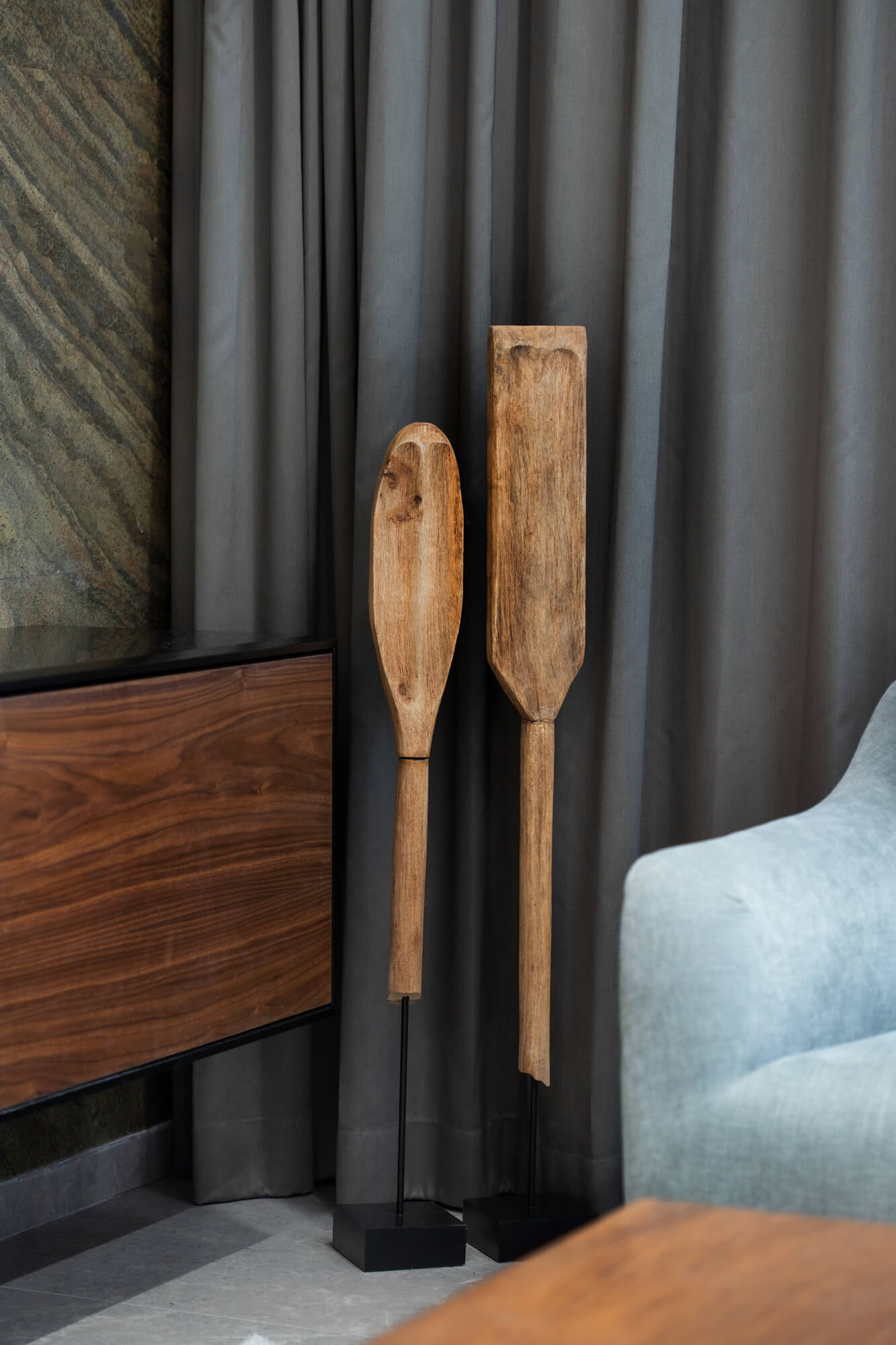 חלל פנים מודרני המאופיין בשילוב חומרים טבעיים כמו עץ ואבן, עם אלמנטים פיסוליים דקורטיביים, ריהוט רך בגוונים רגועים, ותאורה שמדגישה את המרקמים והעומק של הקיר והווילון ליצירת אווירה אלגנטית ומאוזנת.