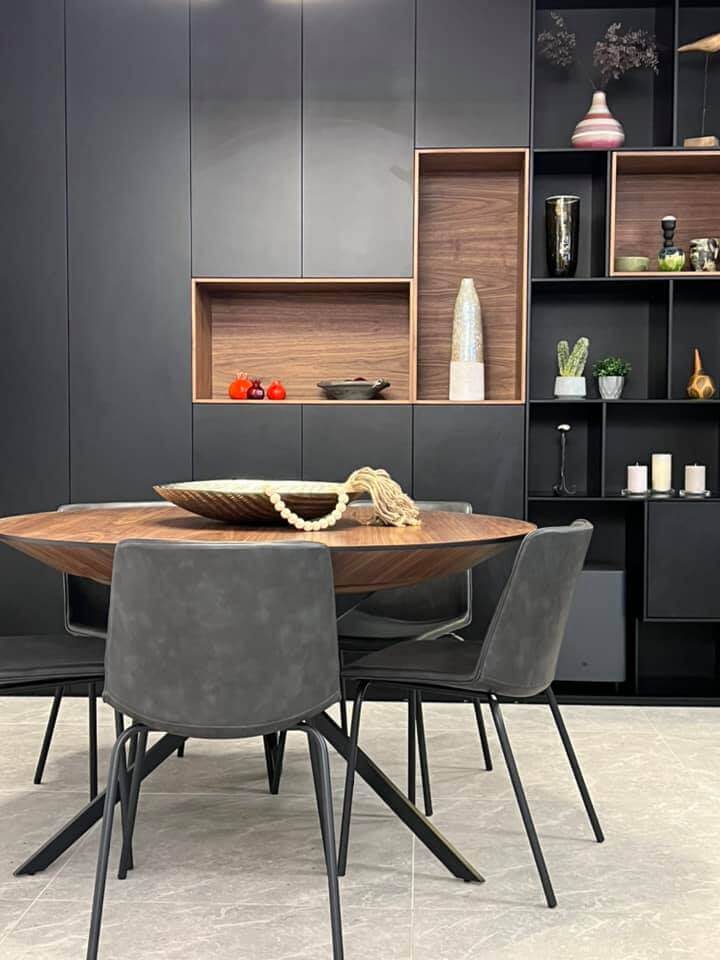 פינת אוכל בעיצוב עכשווי המאופיינת בקווים נקיים, שילוב חומרים טבעיים וגוונים כהים, עם דגש על פרטי נוי שמעניקים לחלל תחושת חמימות, איזון ועניין חזותי.