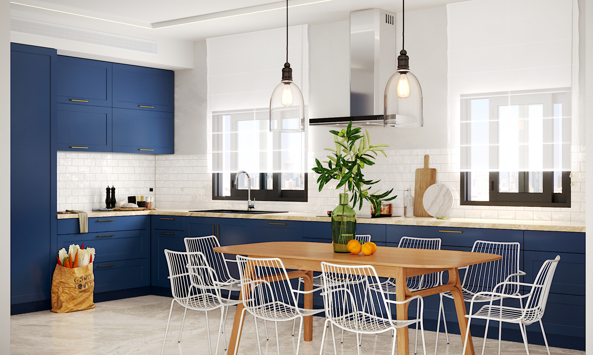 מטבח מודרני ומזמין עם ארונות כחולים וידיות מוזהבות, משטחי עבודה לבנים וחיפוי קיר באריחי סאבווי. שולחן עץ מוקף בכיסאות רשת לבנים עם מושבי עץ, תאורה תלויה, קערת תפוזים וצמח ירוק מוסיפים חום ואופי. חלונות גדולים, שקיות קניות על הרצפה ופרטי עיצוב מדויקים יוצרים חלל פונקציונלי, אלגנטי וביתי.