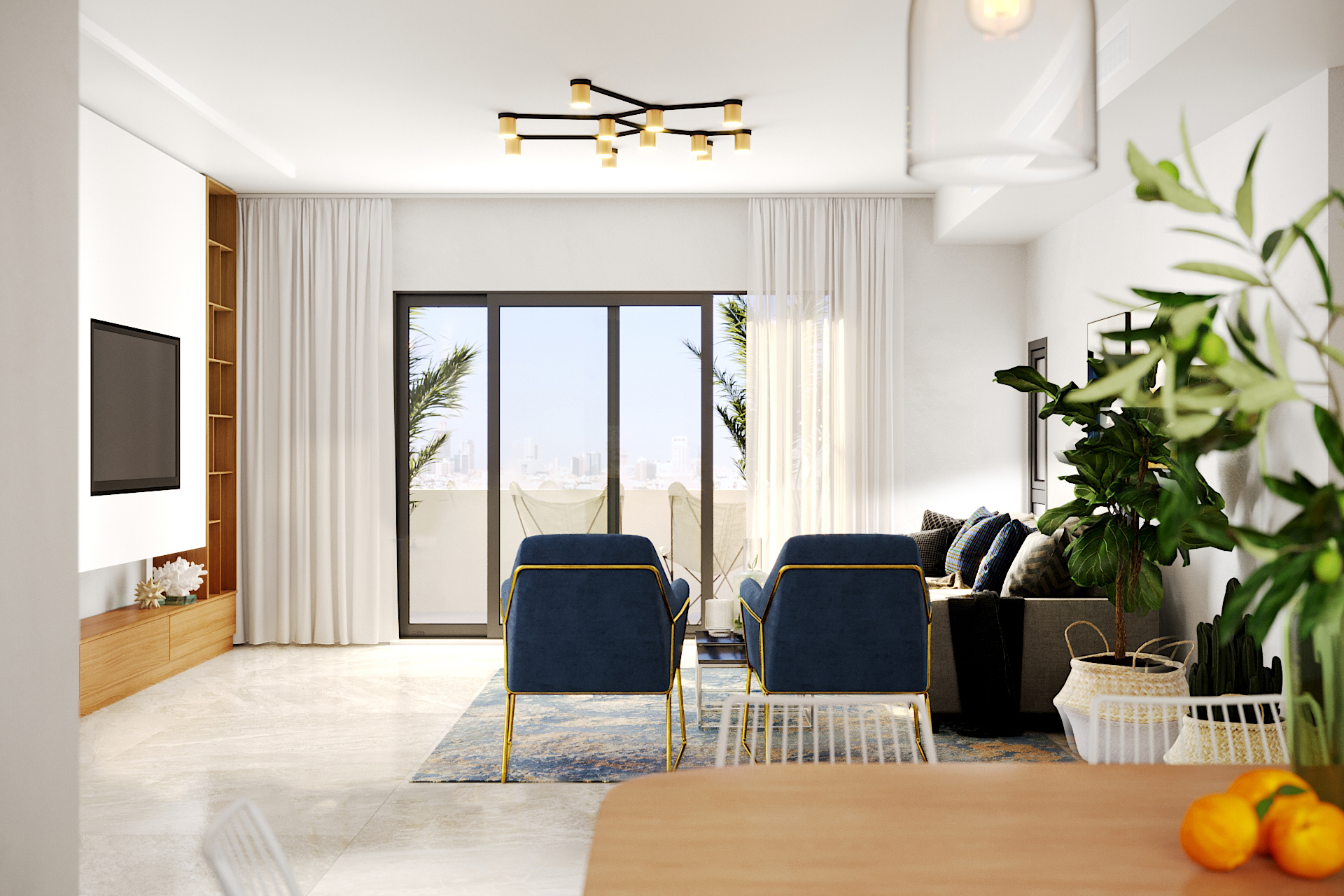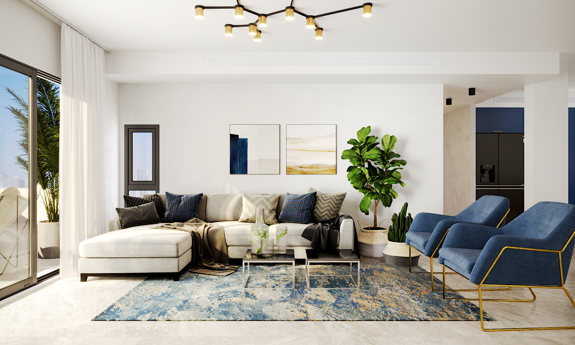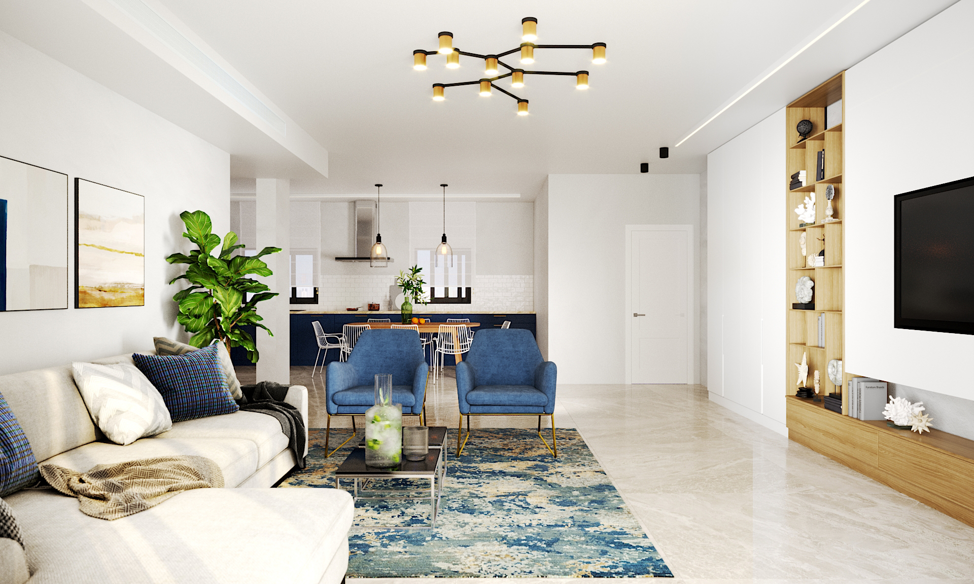 הפרויקט מציג דירה בעיצוב מודרני פתוח, המאופיין בקווים נקיים, גוונים רגועים ושילוב חומרים טבעיים. הסלון כולל ספה פינתית בגוון בז', כורסאות קטיפה כחולות, שולחן קפה מזכוכית ושטיח בדוגמה כחולה-בז'. קיר הטלוויזיה משולב עם מדפי נוי ותאורה נסתרת, והצמחייה הירוקה מוסיפה חיות ורעננות לחלל. גופי תאורה שחורים וזהובים בתקרה משלימים את המראה האלגנטי.