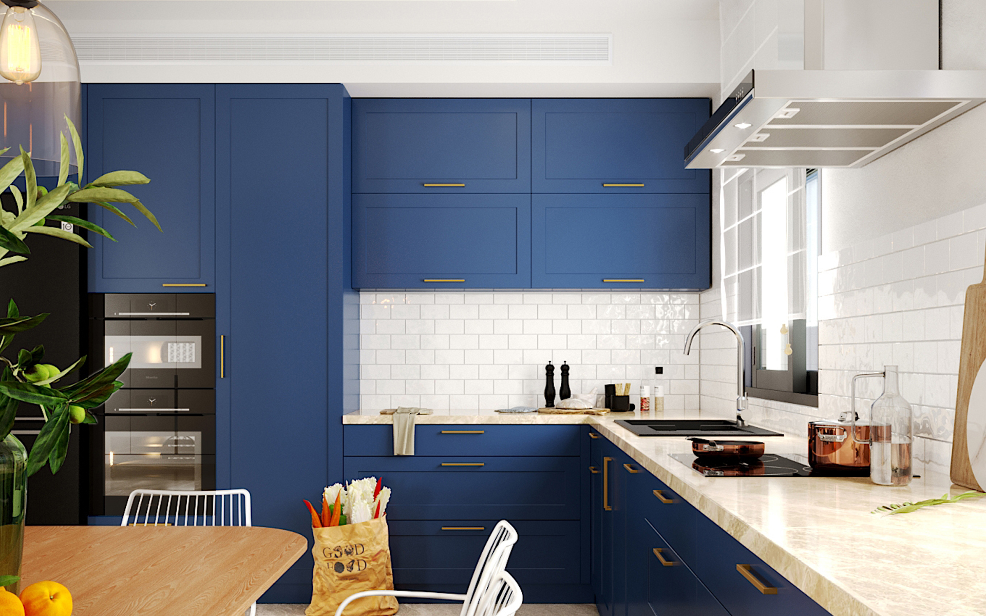 מטבח מודרני עם ארונות כחולים וידיות פליז, משטחי שיש בהירים וחיפוי קיר באריחי סאבווי לבנים. חלון מעל הכיור מכניס אור טבעי, לצד מכשירים מובנים, פרטי בישול על השיש ושולחן אוכל עם פרחים וירקות. עיצוב נקי, נעים ומזמין, שמשלב פונקציונליות עם אסתטיקה עכשווית.