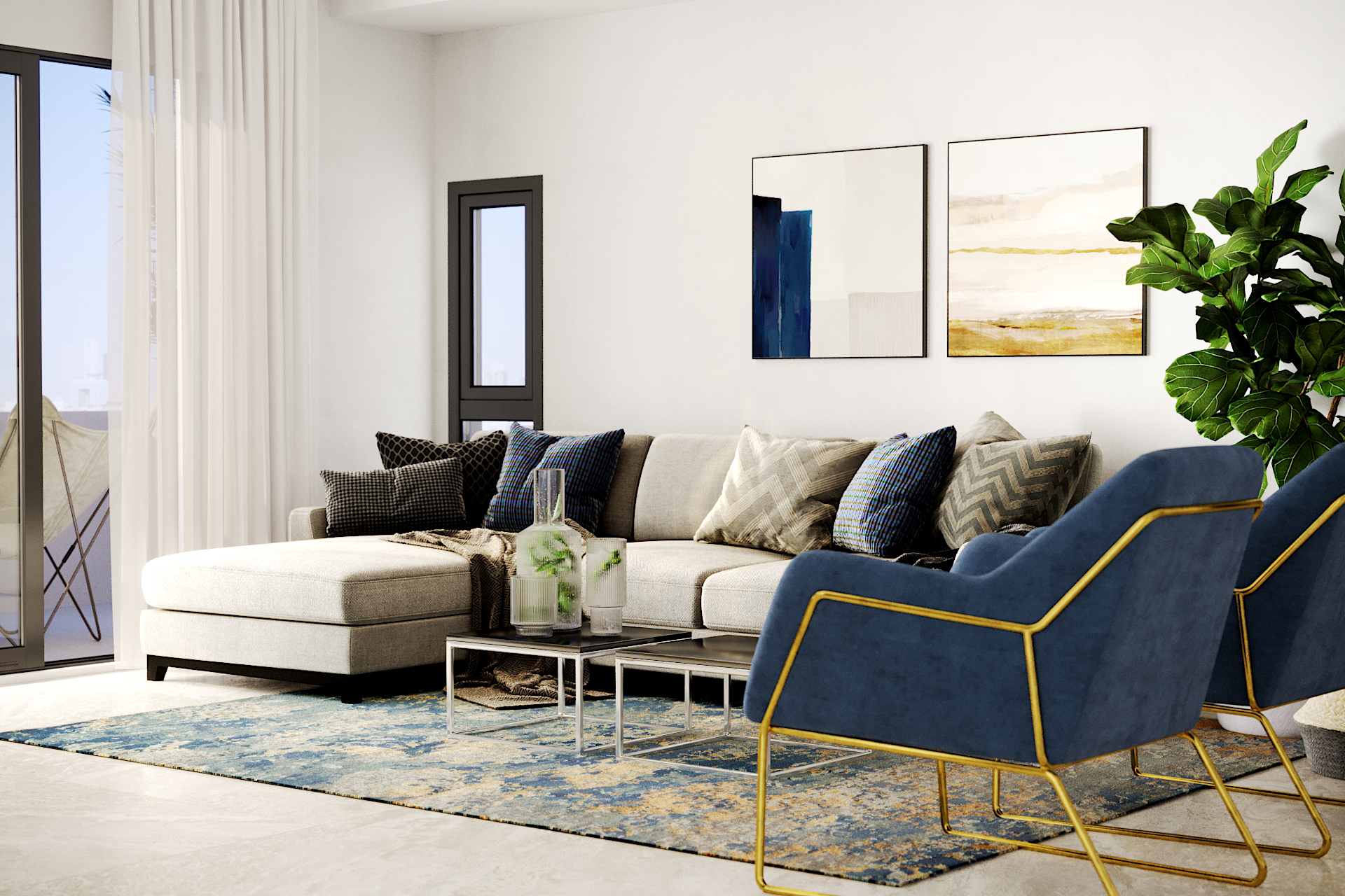 סלון מודרני ומרווח עם ספה בהירה וכורסאות כחולות במסגרת מוזהבת, על שטיח בגווני כחול ובז'. שולחנות קפה מזכוכית, יצירות אמנות מופשטות, צמחייה ירוקה ודלתות זכוכית לנוף עירוני יוצרים חלל אלגנטי, מואר ומזמין. פינת אוכל עם תאורה תלויה וקערת תפוזים מוסיפה חמימות לבית המעוצב בקפידה.